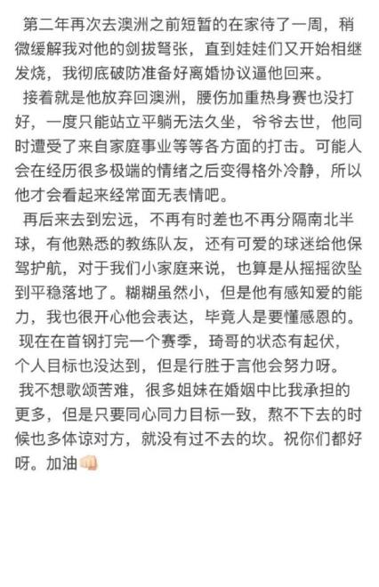 北京時(shí)間昨日,周琦妻子更新社媒,談到了周琦效力于澳洲時(shí)兩人發(fā)生的故事,她表示,澳洲琦是一道坎,甚至帶著離婚協(xié)議去到了民政局。