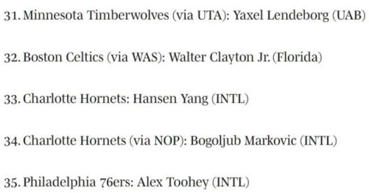 至于中國19歲新星楊瀚森的選秀行情持續(xù)上漲,如今《體育畫報(bào)》預(yù)測楊瀚森第33順位被黃蜂選中,他已經(jīng)在不斷逼近首輪行情。