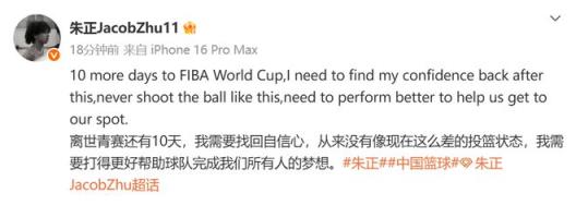 朱正在個人社媒寫道:離世青賽還有10天,我需要找回自信心,從來沒有像現(xiàn)在這么差的投籃狀態(tài),我需要打得更好幫助球隊完成我們所有人的夢想。
