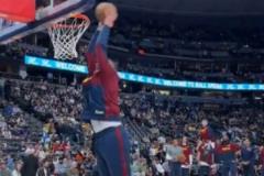賽前熱身環(huán)節(jié),約基奇來了個(gè)打板雙手重扣,引得隊(duì)友歡呼連連。