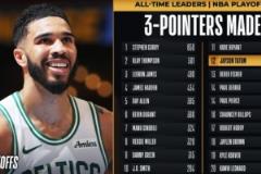 本場比賽過后,塔圖姆(286)季后賽三分命中數(shù)超越費舍爾(285),上升至NBA歷史第12位,排在他前面的是科比(292)。
