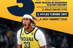 截至發(fā)稿,特納送出2次蓋帽,季后賽蓋帽數(shù)107個(gè)超越希伯特,升至步行者隊(duì)史第二位,拍在他前面的是戴爾-戴維斯的119個(gè),排名第一的是小奧尼爾的120個(gè)。