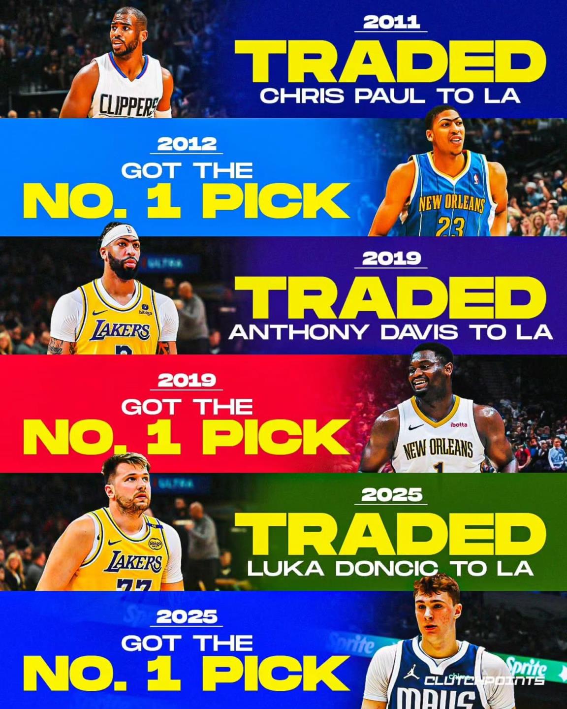 美媒Clutch Points曬出了海報(bào),疑似暗諷聯(lián)盟的暗箱操作。海報(bào)上指出,在2011-12賽季保羅被黃蜂(現(xiàn)鵜鶘)交易到快船后,黃蜂在當(dāng)年抽中狀元簽得到安東尼-戴維斯;在戴維斯2018-19賽季被鵜鶘交易到湖人后,鵜鶘得到了狀元簽并選中錫安-威廉森;在2024-25賽季東契奇被獨(dú)行俠交易到湖人后,獨(dú)行俠抽中了狀元簽并大概率將選中弗拉格。