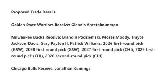 雄鹿得到:波杰姆斯、穆迪、戴維斯、小佩頓、帕威、勇士26年首輪、勇士28年首輪、公牛27年首輪、公牛29年首輪、公牛28年次輪簽。