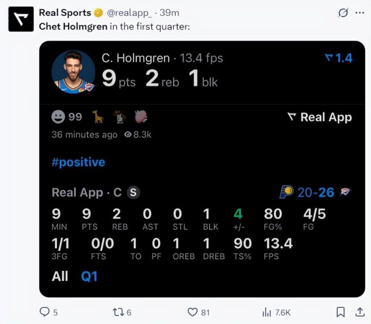 G1霍姆格倫24分鐘9中2拿6分6籃板,他在決勝時(shí)刻被戴姆波特給DNP了,這個(gè)DNP也是步行者逆轉(zhuǎn)的X因素,G2戴姆波特決定再度信任切特,首節(jié)切特9分鐘里5中4+三分1中1拿到9分2籃板1蓋帽,真實(shí)命中率高達(dá)90%。