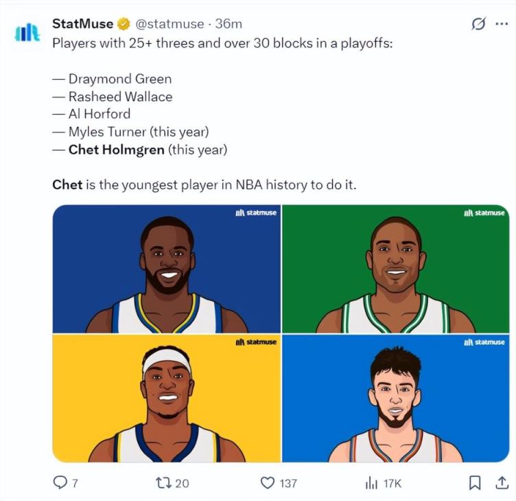 數(shù)媒:單詞季后賽三分命中數(shù)超過25+且蓋帽數(shù)超過30次的球員:追夢、拉希德華萊士、霍福德、特納、霍姆格倫,切特是NBA最年輕達(dá)成這一數(shù)據(jù)的球員。