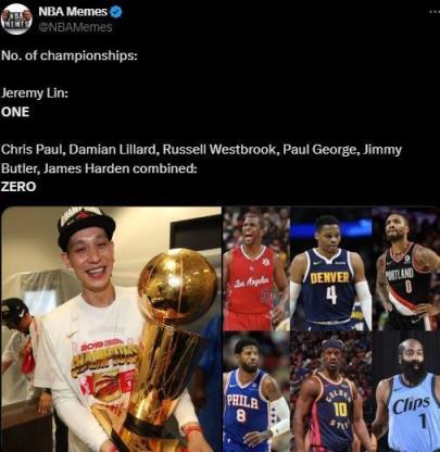 “哈登、保羅、利拉德、威少、喬治和巴特勒加起來0冠,但林書豪有1冠?!盢BA Memes寫道。