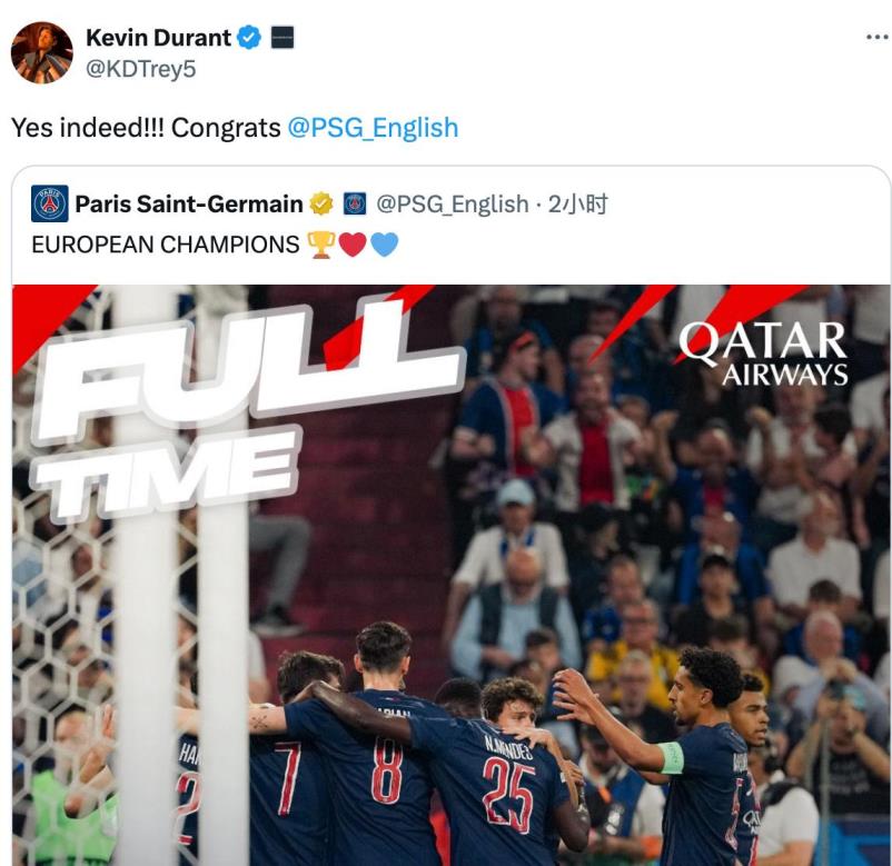 2024-25賽季歐冠決賽,巴黎圣日耳曼5-0大勝國際米蘭,加冕三冠王。NBA球星杜蘭特也在社媒祝賀巴黎圣日耳曼奪得歐冠冠軍。