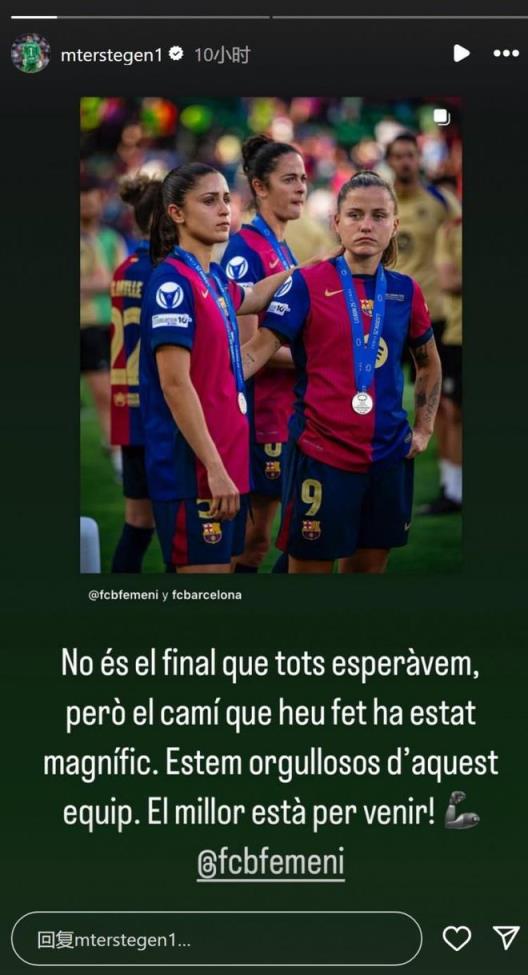 巴薩男足門將特爾施特根更新社媒動(dòng)態(tài),他曬出女足姑娘的照片,并配文:“這不是我們所有人期待的結(jié)果,但這支球隊(duì)走過(guò)的道路是輝煌的。我們?yōu)檫@支球隊(duì)感到驕傲,最好的還在后面!”