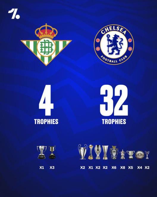 北京時(shí)間5月29日,皇家貝蒂斯和切爾西將在史拉斯科球場(chǎng)爭(zhēng)奪本賽季歐協(xié)聯(lián)冠軍。在決賽開始前,足球媒體OneFootball在社媒上發(fā)布了兩隊(duì)歷史榮譽(yù)數(shù)量的對(duì)比。