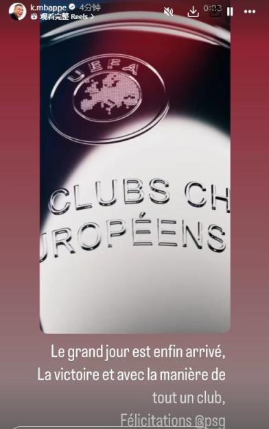 姆巴佩祝福巴黎奪冠:“偉大的日子終于來(lái)臨,這場(chǎng)勝利是屬于整個(gè)俱樂(lè)部的榮光。恭喜@巴黎圣日耳曼?!薄?/p>
