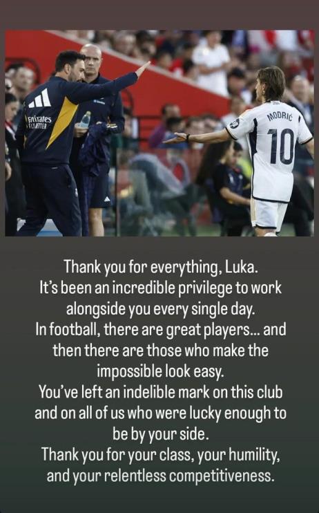 達(dá)維德-安切洛蒂表示:“謝謝你所做的一切,莫德里奇。能在這里每天與你一起工作是莫大的榮幸。在足球領(lǐng)域,有偉大的球員,也有讓不可能的事情看起來(lái)非常容易的球員。你為這家俱樂(lè)部留下了不可磨滅的印記,也在我們每個(gè)人身上留下了印記,我們非常幸運(yùn)能在你身邊。謝謝你的指導(dǎo),你的謙遜,以及你無(wú)休止的努力?!?/p>