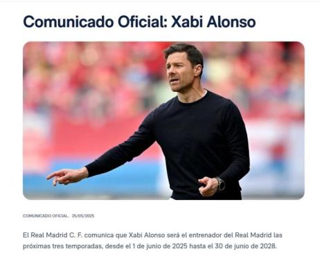 北京時間5月25日晚,西甲豪門皇家馬德里俱樂部官方宣布,43歲的哈維-阿隆索將在今夏正式接替安切洛蒂,擔(dān)任皇馬新任主教練,雙方將簽約3年(2025年6月1日至2028年6月30日),年薪1200萬歐元。