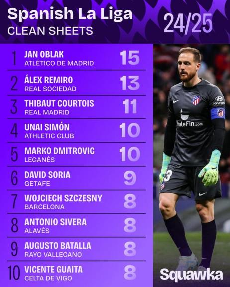 2024/25賽季西甲聯(lián)賽門將零封場次排行榜