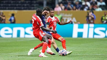 巴黎圣日耳曼與拜仁慕尼黑在亞特蘭大展開巔峰對決,本場主裁判為安東尼·泰勒。上半場,諾伊爾與多納魯馬各獻神撲,斯塔尼希奇和穆西亞拉先后受傷。下半場,杜埃打破僵局,隨后威廉·帕喬與盧卡斯接連被直紅罰下;九人作戰(zhàn)的巴黎最后時刻由阿什拉夫連過三人助攻登貝萊破門鎖定勝局。最終,巴黎2比0力克拜仁,晉級世俱杯四強。