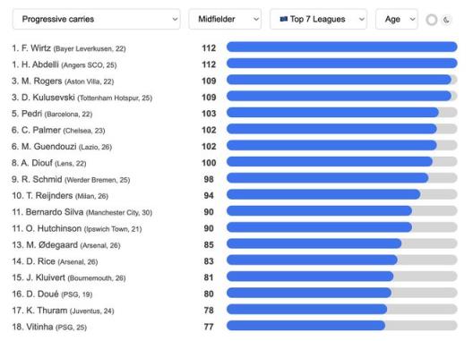 北京時間5月27日,足球專業(yè)數(shù)據(jù)平臺DataMB公布了本賽季歐洲七大聯(lián)賽中持球推進次數(shù)最多的球員前20名,勒沃庫森中場球星維爾茨以112次持球推進次數(shù)與昂熱球星希馬德-阿卜杜利并列第一。