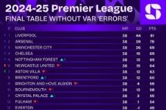 根據(jù)投票結(jié)果,Squawka列出本賽季英超聯(lián)賽若無VAR誤判情況下的積分榜,利物浦81分奪冠,阿森納79分次席,曼城第三。諾丁漢森林將參加下賽季歐冠,紐卡踢歐聯(lián),維拉踢歐協(xié)聯(lián)。