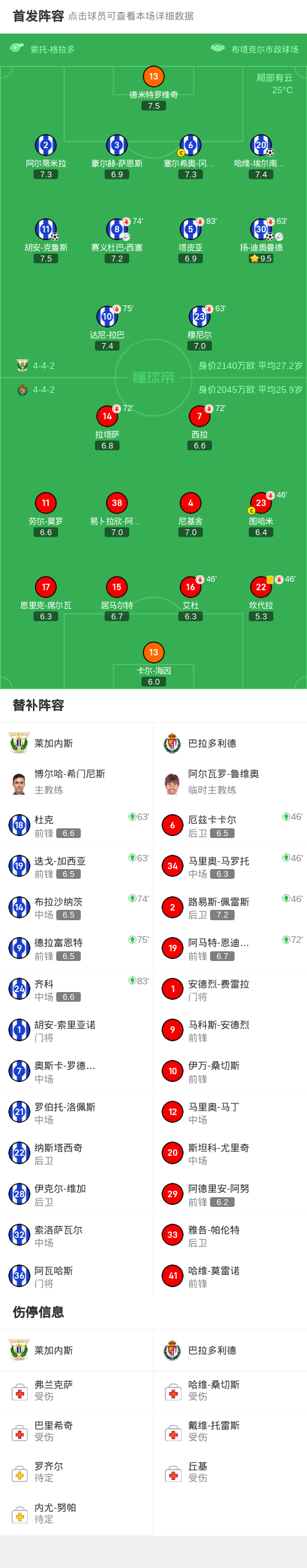 北京時(shí)間5月25日西班牙足球甲級(jí)聯(lián)賽 聯(lián)賽 第38輪,萊加內(nèi)斯主場(chǎng)對(duì)陣巴拉多利德。萊加內(nèi)斯哈維-埃爾南德斯破門(mén),揚(yáng)-迪奧曼德破門(mén),胡安-克魯斯破門(mén)。最終比分萊加內(nèi)斯 3 - 0 巴拉多利德。